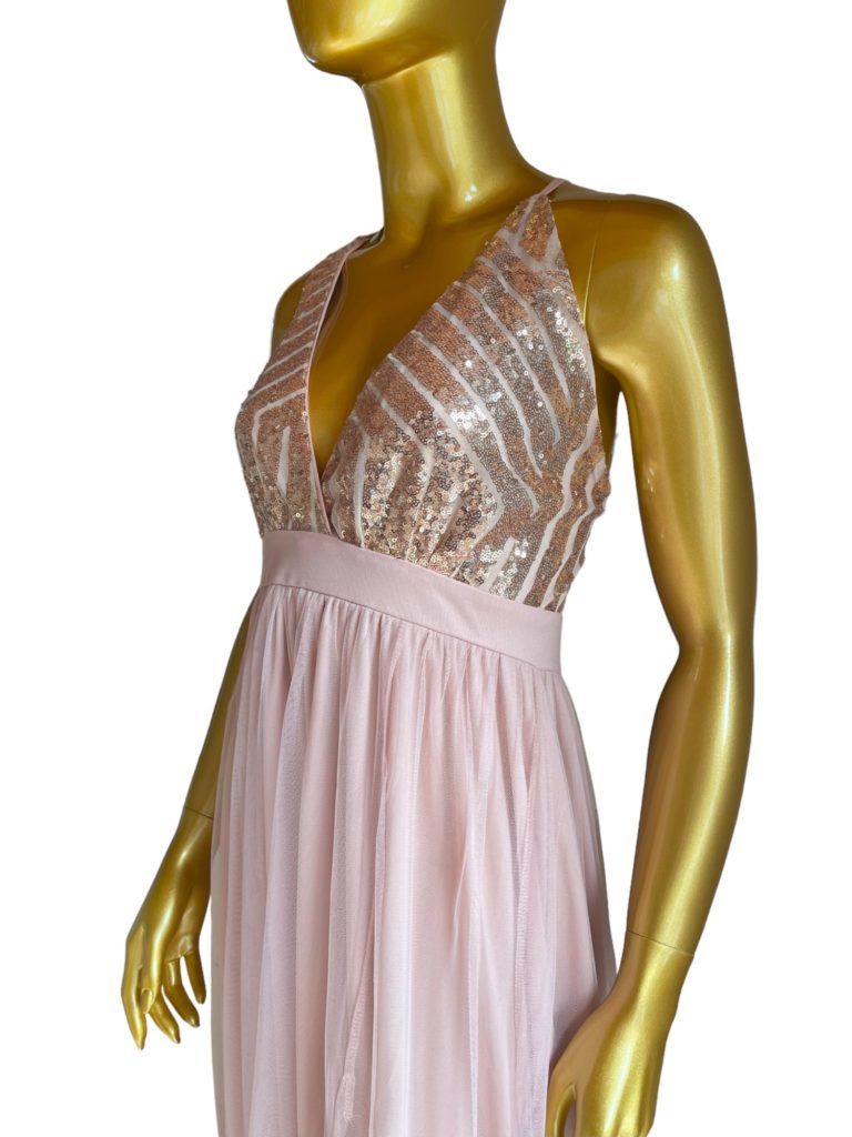 La robe Amanda à sequins de couleur rose gold sera parfaite pour te mettre en valeur, avec son bustier, sa jupe fluide et ses bretelles réglables.