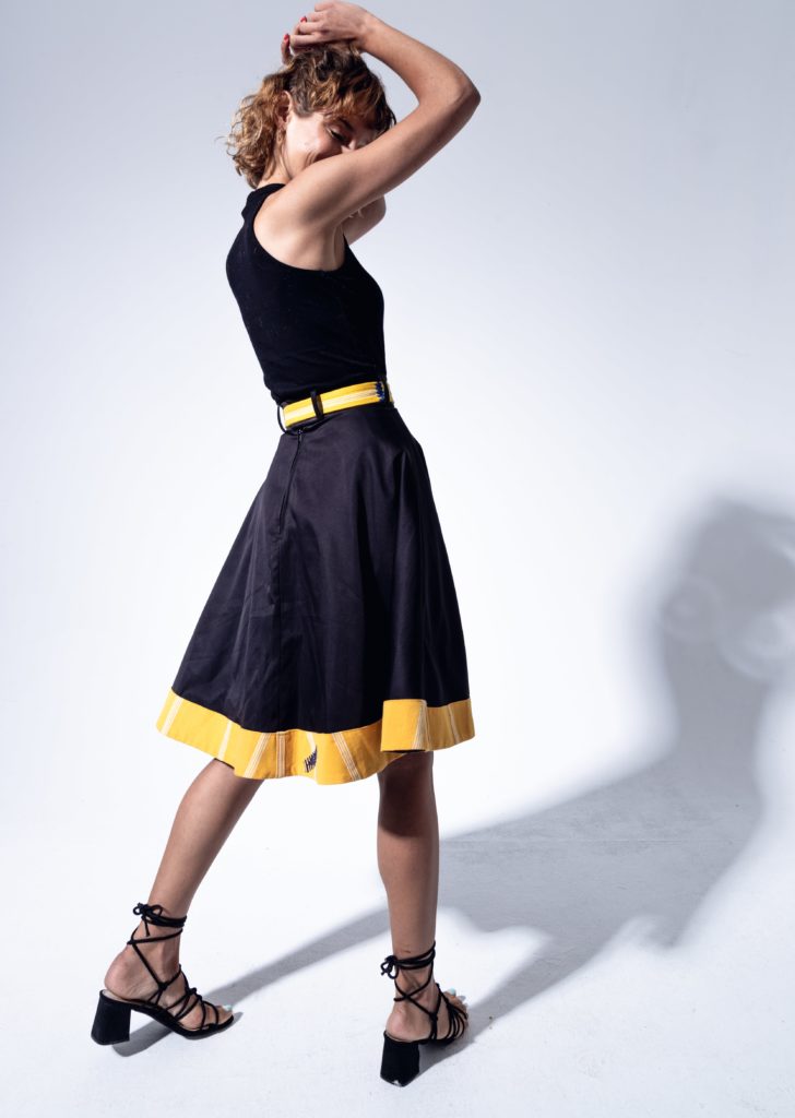 La jupe Bida en soie de chez la Paris’Hyène. Une jupe midi évasée à la taille marquée, accompagnée de sa ceinture en Faso Dan Fani et ses touches de jaunes. Cette pièce originale pourra t’accompagner pour toutes occasions.