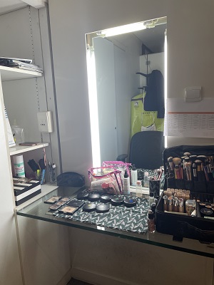 On l’installe dans un petit bureau réservé pour le maquillage, léger, pour éviter les brillances et autre petits défauts, enfin ce qui peut être masqué 😮