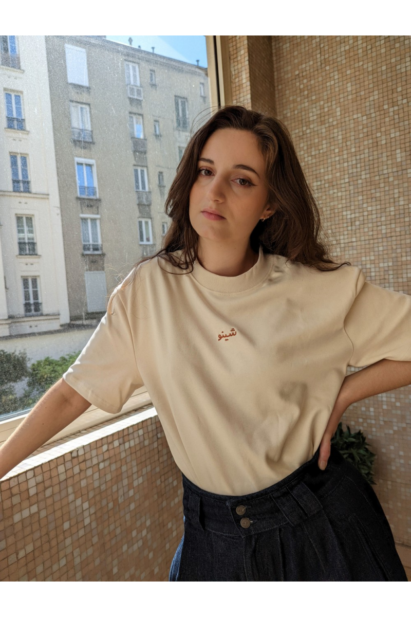 Il est orné d’une broderie terracotta en calligraphie arabe au centre du vêtement : 〞شینو“ (= 〞 Chez Nous.”, traduction phonétique).