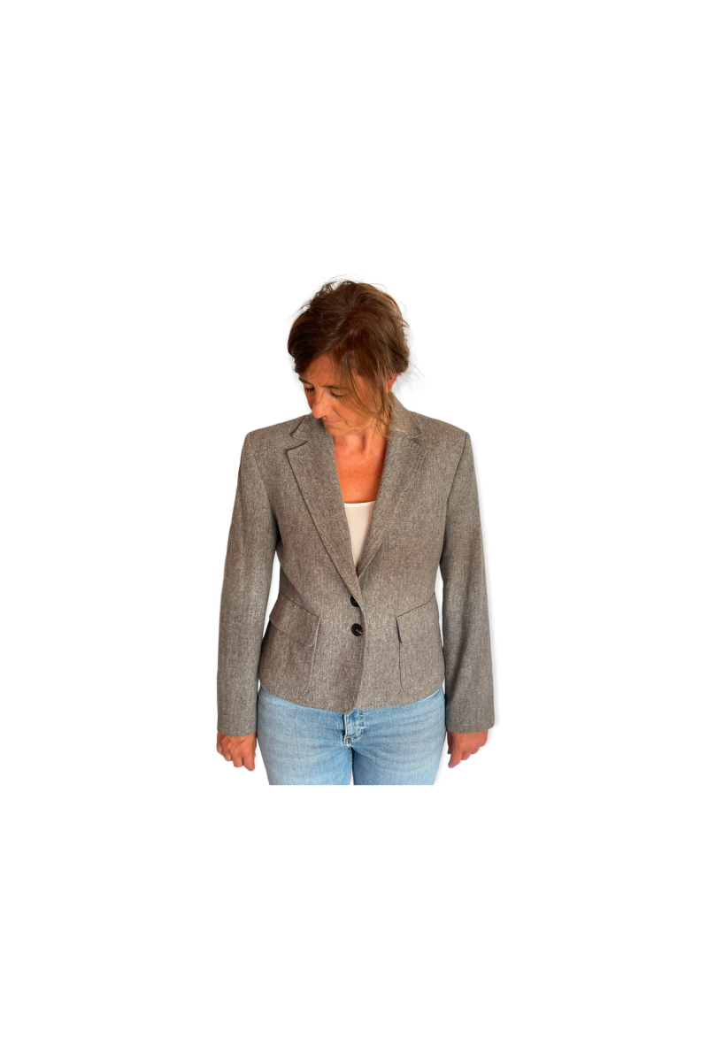 Veste de tailleur grise, idéale avec un pantalon noir ou un jeans et un chemisier blanc.