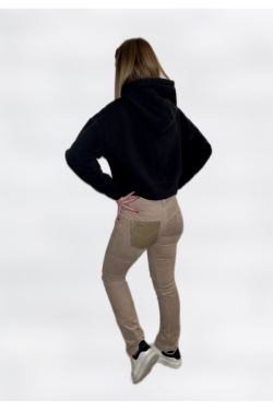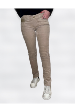 Pantalon en velours côtelé beige, slim, poche en cuir pour un style original et casual