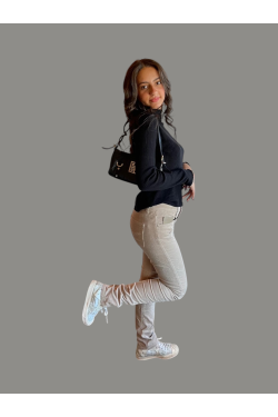 Pantalon en velours côtelé beige, slim, poche en cuir pour un style original et casual