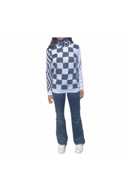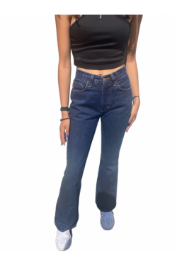 Pantalon en jean bleu foncé, coupe droite puis évasée au niveau du bas